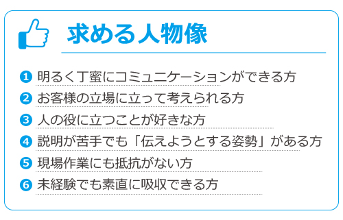 | 必要な経験・知識・技能等 | 不問 未経験の方も安心してご応募ください。 入社後は先輩が丁寧にサポートします。 経験・スキルのある方は、給与・採用条件において優遇いたします。 |