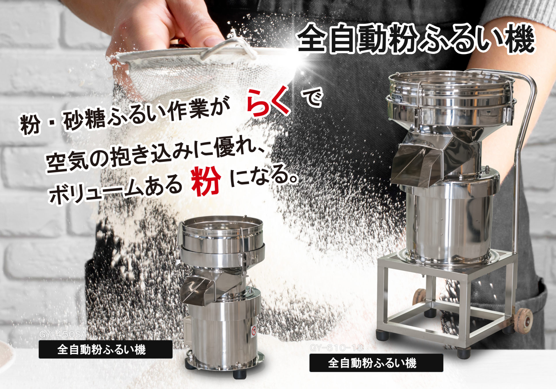 | GY-300 卓上型 | 310×360×560mm | 300Φ | 100v 125w | 粉:24メッシュ・砂糖:12メッシュ | 120kg / 時 |