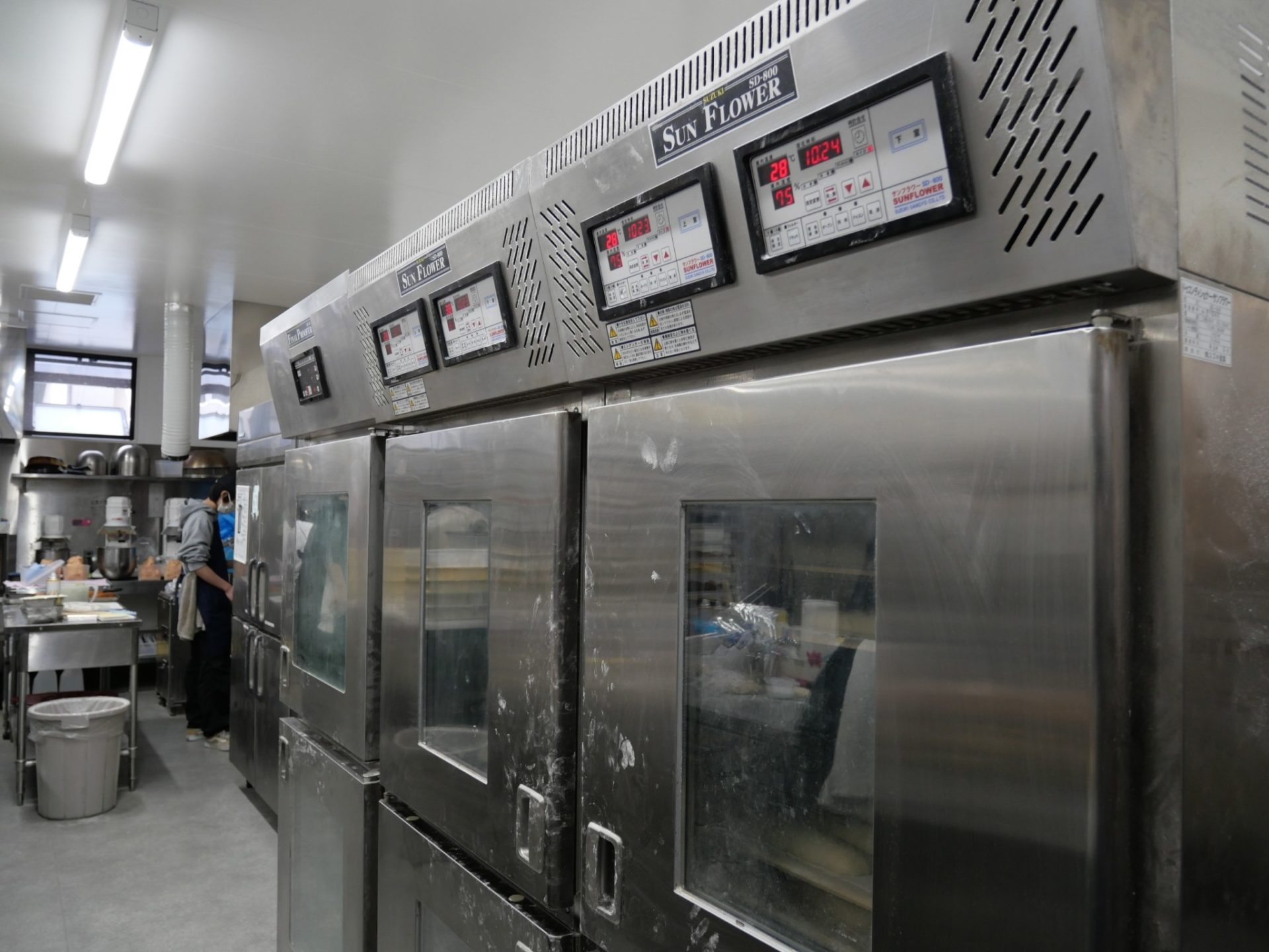 大規模な厨房に多数の機器を導入しました。トーラックスオーブン、コンベクションオーブン、ホイロ、ドゥコンディショナー、パイローラー、カスタードクッカー、スパイラルミキサー、60コートミキサー、ショーケース、プレハブ冷凍庫などを設置。入念なレイアウト計画から搬入・納品・設置・試運転まで無事完了しました。